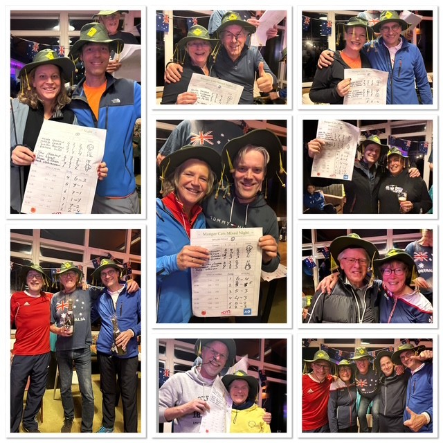 Afgelopen vrijdag 6 november was het voor de 3e keer na covid ‘Mixed Night’ als afsluiter van het tennisseizoen. Na eerdere ‘Grand Slam’ edities met als thema Roland Garros en Wimbledon, werd die traditie door Tim Wolff en Ellis van Doorn voortgezet in het thema Australian Open. Het clubhuis kleurde in de Australische vlag. De banen waren overdag al schoongeveegd van de bladeren door wie anders dan Timo Bierhoff en ondermeer Ellis waardoor ze er perfect bij lagen. De regen bleef uit, de temperatuur zacht voor het jaar, dus het was wachten op een top avondje. Bijna 60 dames en heren hadden zich aangemeld en rond kwart voor acht was het clubhuis volgestroomd met deelnemers. Ellis had over de 7 banen het schema gemaakt op speelsterkte. Een nieuw element was een golden point bij de stand van 40-40, waarbij de ontvanger kon kiezen op welke zijde geserveerd moest worden voor het winnende punt van de game. Er werd flink maar vriendschappelijk gestreden op de banen in steeds wisselende mixed koppels. In de tussentijd waren Ria en Marjolein as vrijwillige barcommissie druk doende om iedereen van een drankje en happen te voorzien, ook dit jaar gesponsord door ICM Opleidingen. Rond elf uur waren alle potten gespeeld en gingen Ellis en Tim aan de slag om de winnaars uit te rekenen. Er werden bitterballen, vlammetjes en andere happen rondgebracht, de bar draaide op volle toeren en de stemming ging naar een hoogtepunt. Alle heren en dames winnaars van de poel werden naar voren geroepen om de prijs, een heuse Australische Hoed met kangoeroe logo en kurkjes tegen de vliegen, in ontvangst te nemen. Geeke nam daarbij een paar mooie kiekjes voor in de archieven van de club.