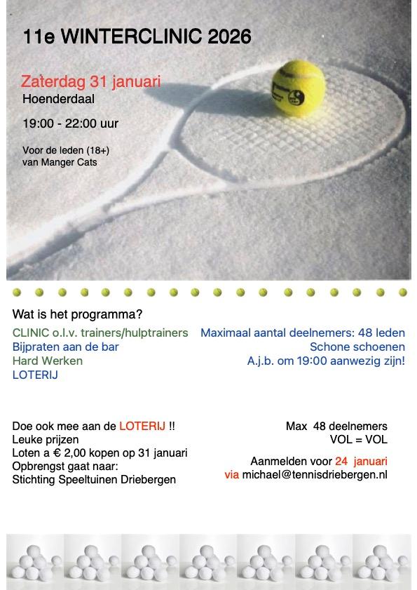 De tennisleraren hebben daar banen vanaf 19:00 uur 5 banen gereserveerd voor de deze clinic. Naast lekker hard werken op de baan is het ook gezellig naast de baan. Ontmoet andere leden van Manger Cats in een sportieve setting. Deelname is gratis.